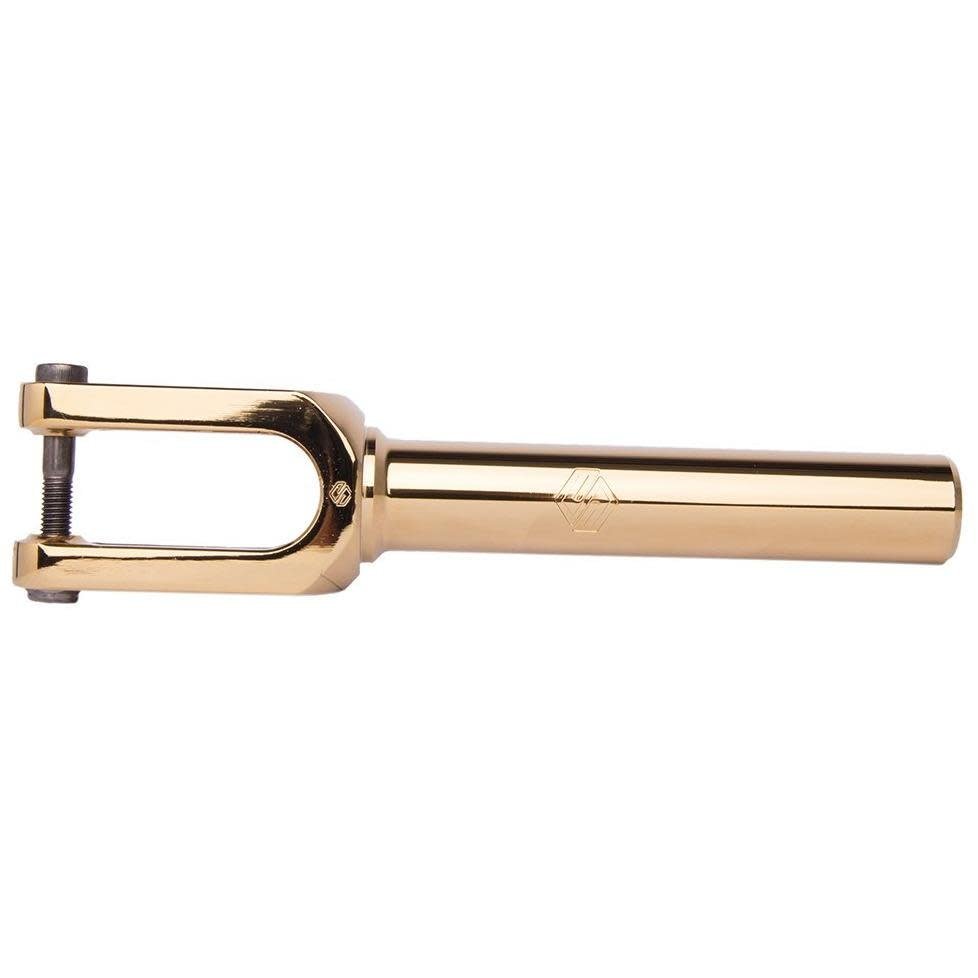 Der Striker Lux voorvork in is een CNC-gefreesde voorvork voor freestyle steppen. Deze Striker Lux voorvork is bedoeld voor unisex rijders die een stijve, strakke en betrouwbare voorkant willen voor SCS/HIC-setups. Het grote voordeel: SCS/HIC-compatibiliteit zonder omweg en een sterke eendelige constructie. Op de foto zie je de glanzende gold‑chrome afwerking met het subtiel aangebrachte STRIKER-logo op de voorkant. De strakke freeslijnen rond de kroon, de nette, vlakke dropouts en de rechte stuurbuis vallen direct op. De combinatie van éénstuk aluminium, precieze bewerking en de beschermende ‑chroom finish geeft stabiliteit, duurzame looks en een clean geheel.