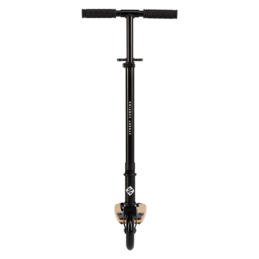 Je ziet de strakke afwerking zonder franje. Het Street Surfing-logo staat op deck en stuurkolom. De combinatie van grote wielen, het stabiele stuur en antislip griptape geeft rust en controle tijdens korte ritten en dagelijkse omwegen.