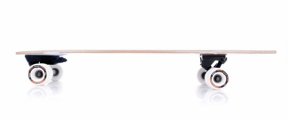 Je ziet een hoogdraaiende voortruck voor grote stuuruitslag, een stabielere achtertruck en nette gripdetails tot aan de randen. De combinatie van korte wielbasis, riserpads en soepele wielen geeft direct stuurgedrag, grip en demping op ruw asfalt.