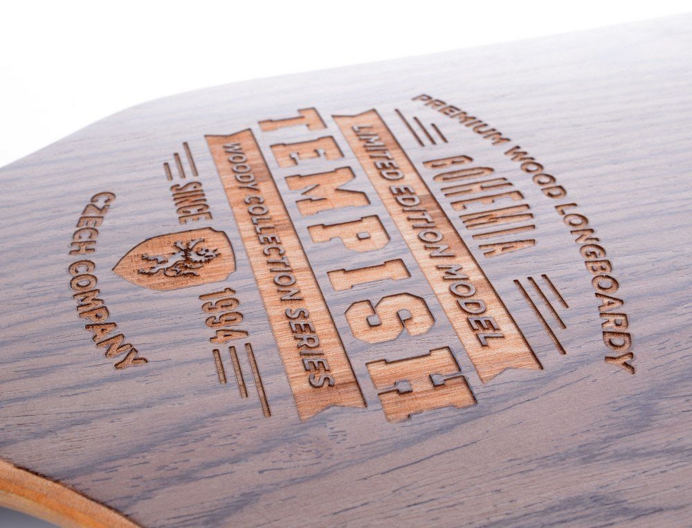 De onderzijde toont een houtnerf met strakke Bohemia-graphics en het Tempish-logo. Gepolijste reverse-kingpin trucks met zwarte bushings. De combinatie van ruime cut-outs, brede wielen en een lichte concave geeft grip, wendbaarheid en minder wheelbite.