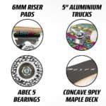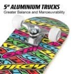• Trucks: 5″ aluminium, sturdy and reliable.