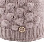 This beanie with polka dot knit and pompon offers warmth and a striking look.