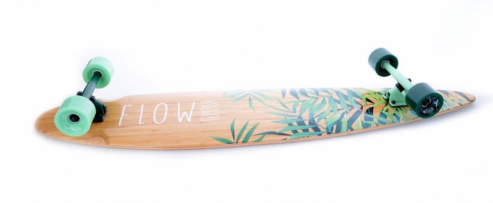Het grote voordeel: veel stabiliteit door de lange wheelbase en een rustige, vergevingsgezinde flex. Op de foto zie je een lang houten deck met groot FLOW-opschrift, een strak afgewerkte zwarte griptape en brede zwarte wielen.