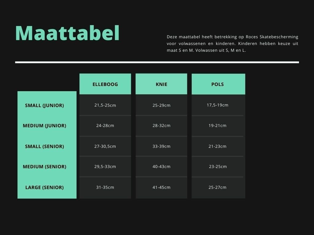 De skatebescherming set in zwart is een driedelige beschermset voor skaters en riders. Deze skatebescherming set is bedoeld voor unisex volwassenen die zonder gedoe veilige, betrouwbare bescherming willen bij urban ritten, inline skaten of skateboarden. Het grote voordeel: harde caps verdelen impact en beperken schaafwonden. Op de foto zie je knie-, elleboog- en polsbeschermers met matte zwarte doppen, witte ROCES-logo’s en brede klittenbandstraps die eenvoudig verstellen. Je ziet klinknagels in de doppen, ademend mesh en een nette afwerking met stevige stiksels. Ook staat er een maatwijzer afgebeeld met meetpunten om de juiste maat te kiezen. De combinatie van hardshell caps, dempend foam en een strakke pasvorm geeft zekerheid en comfort, zonder onnodige bulk.