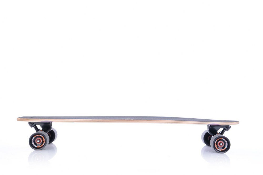 Het grote voordeel: veel stabiliteit zonder log aan te voelen. Op de foto zie je een fish-shaped deck met strak zwart griptape, gepolijste aluminium trucks en zachte cruiserwielen; de onderzijde heeft een opvallende visprint.